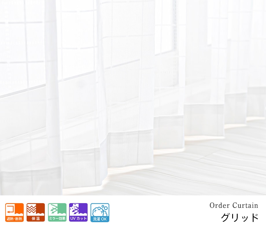 カジュアルなチェック柄のUVカットミラーレースカーテン「グリッド」ホワイト