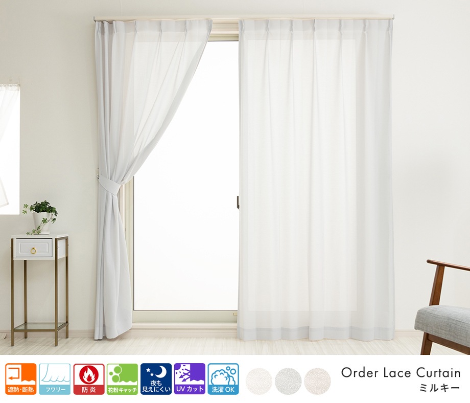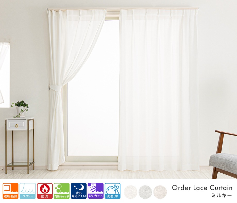 ラメを全体に織り込んだ柔らかい手触りの防炎遮像レースカーテン「ミルキー」ホワイト