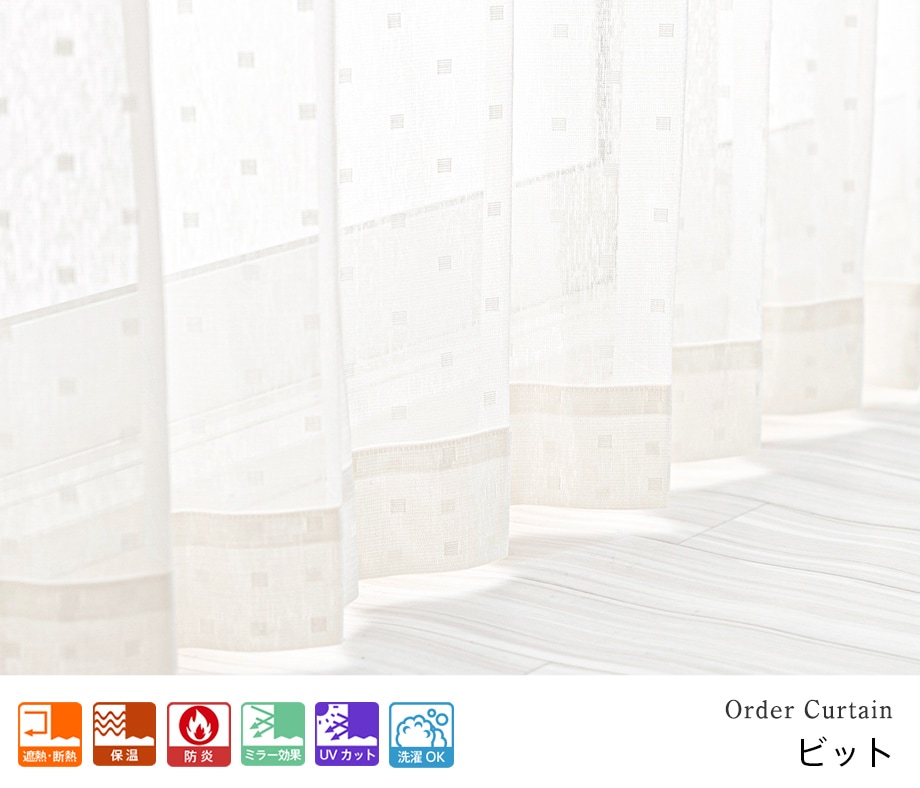 四角いドット柄の防炎UVカットミラーレースカーテン「ビット」ナチュラル