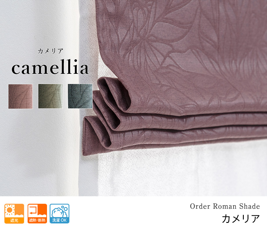 エレガントなエンボス加工を施したボタニカル柄の1級遮光ダブルシェード「カメリア」バーガンディー