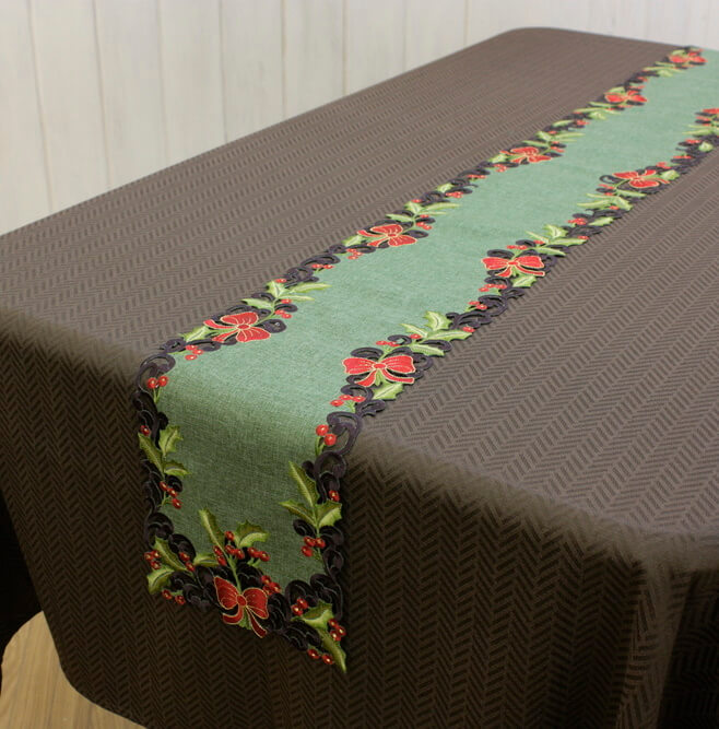 Xmas ヒイラギ 刺繍 テーブルランナー 約20×160cm