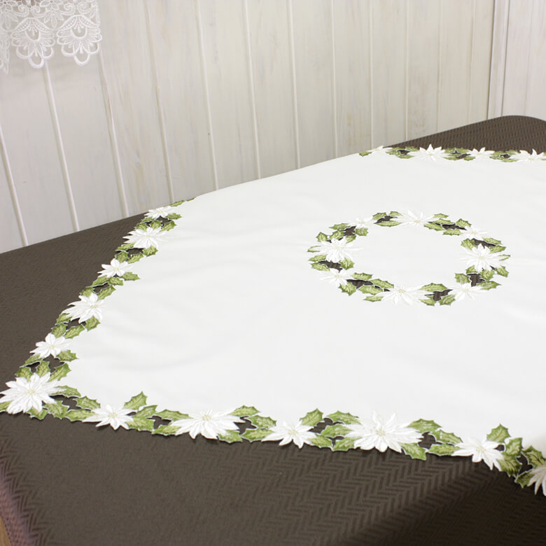 Xmas 白いポインセチア 刺繍 テーブルクロス 約85×85cm