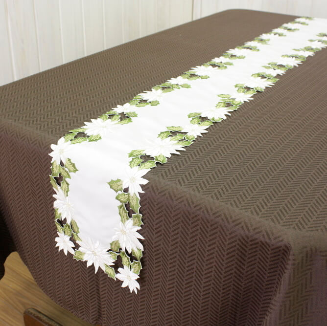Xmas 白いポインセチア 刺繍 テーブルランナー 約20×160cm