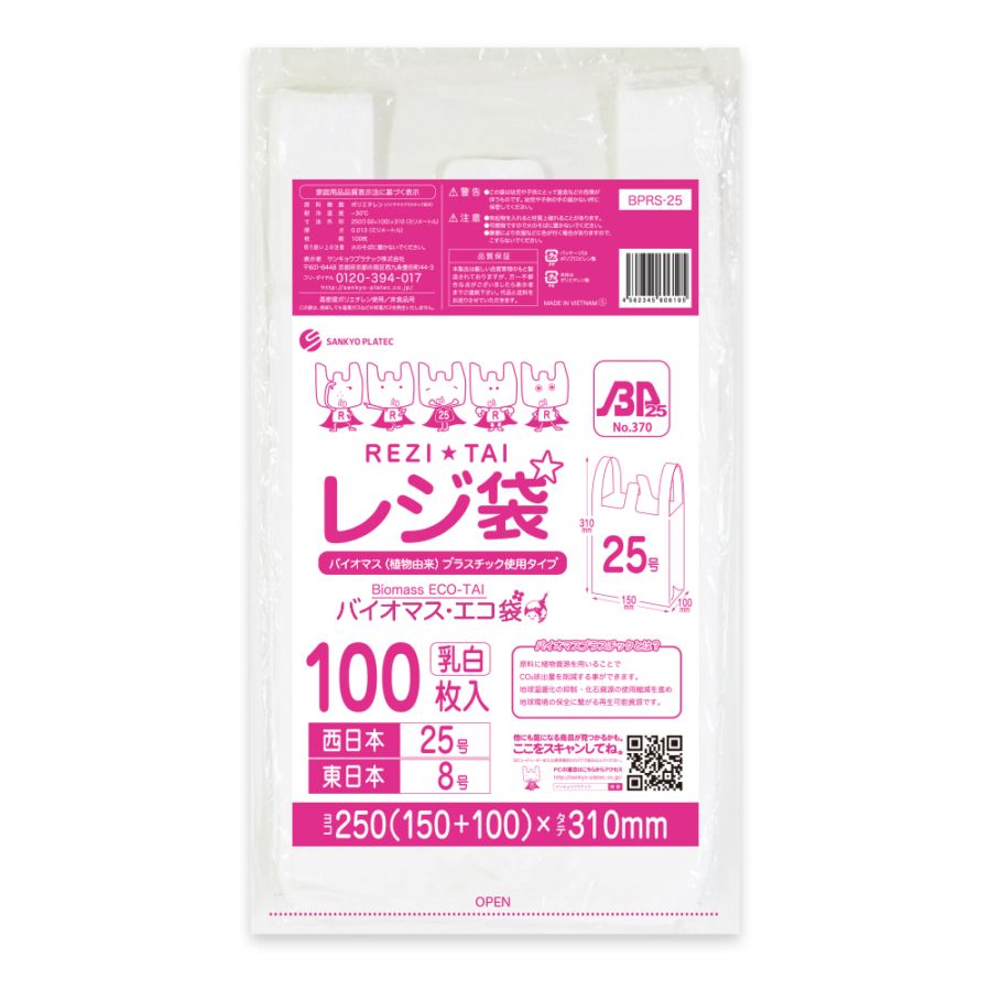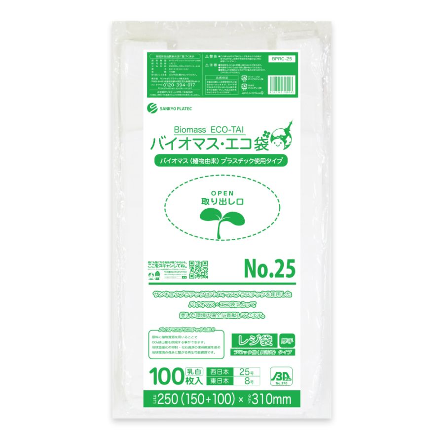 バイオマスプラスチック25%配合 レジ袋 厚手長舌片タイプ 西日本25号 ブロック有 乳白 0.013mm厚(100枚×80冊)