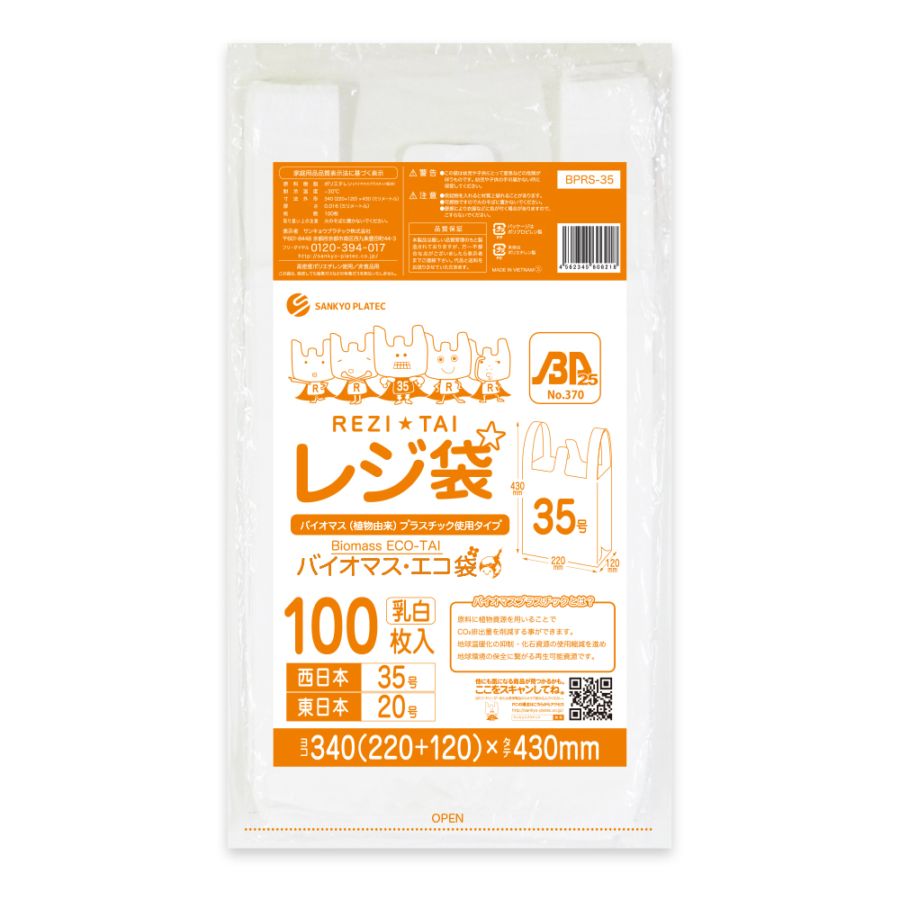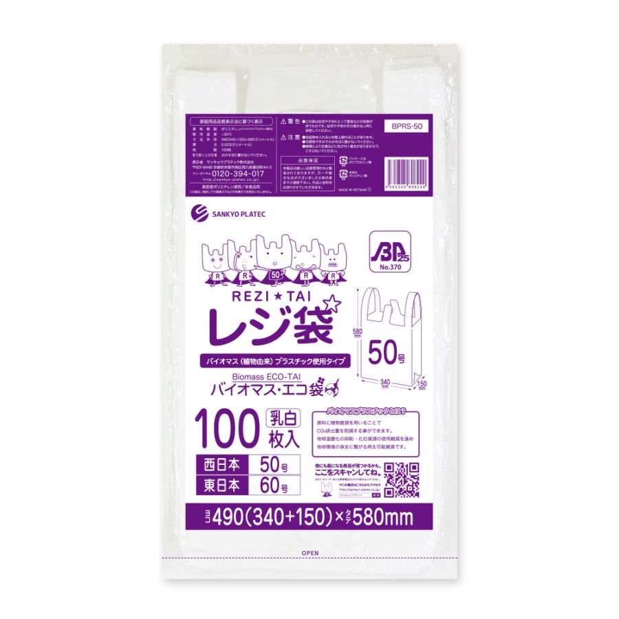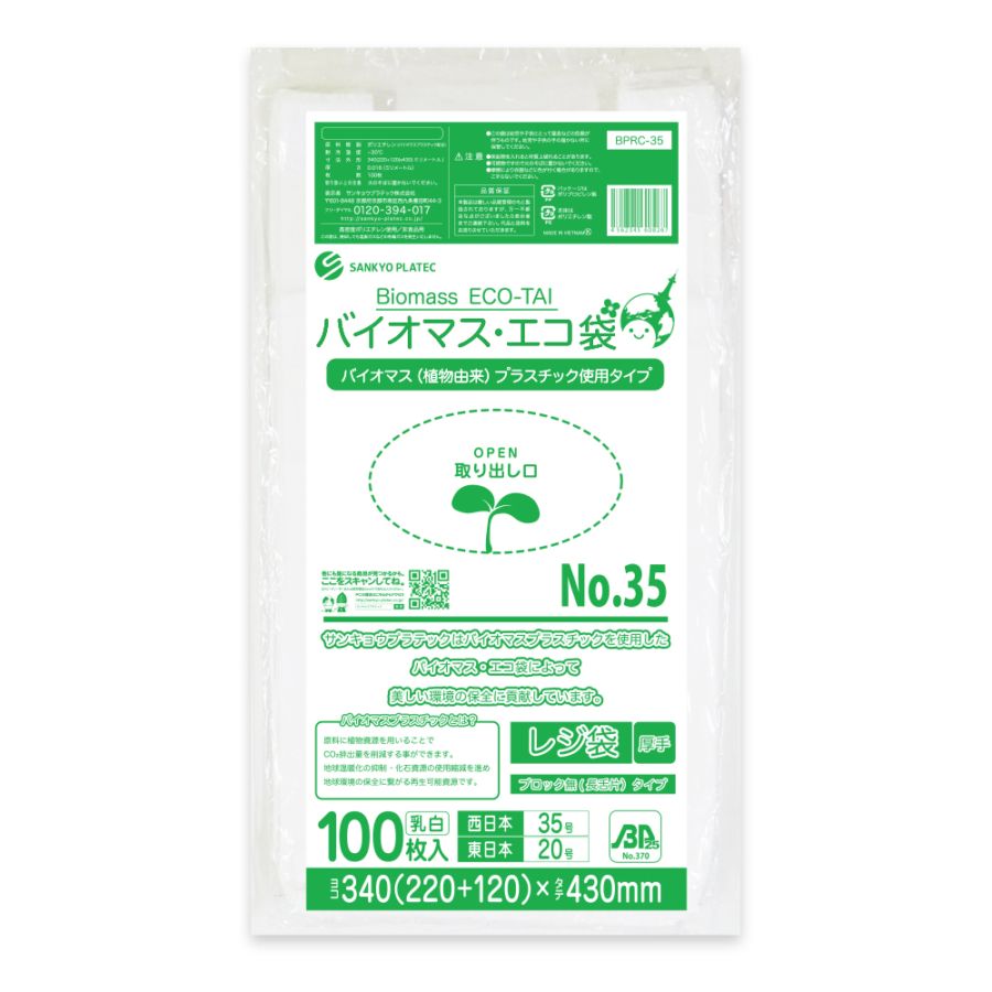 バイオマスプラスチック25%配合 レジ袋 厚手長舌片タイプ 西日本35号 ブロック有 乳白 0.016mm厚(100枚×50冊)