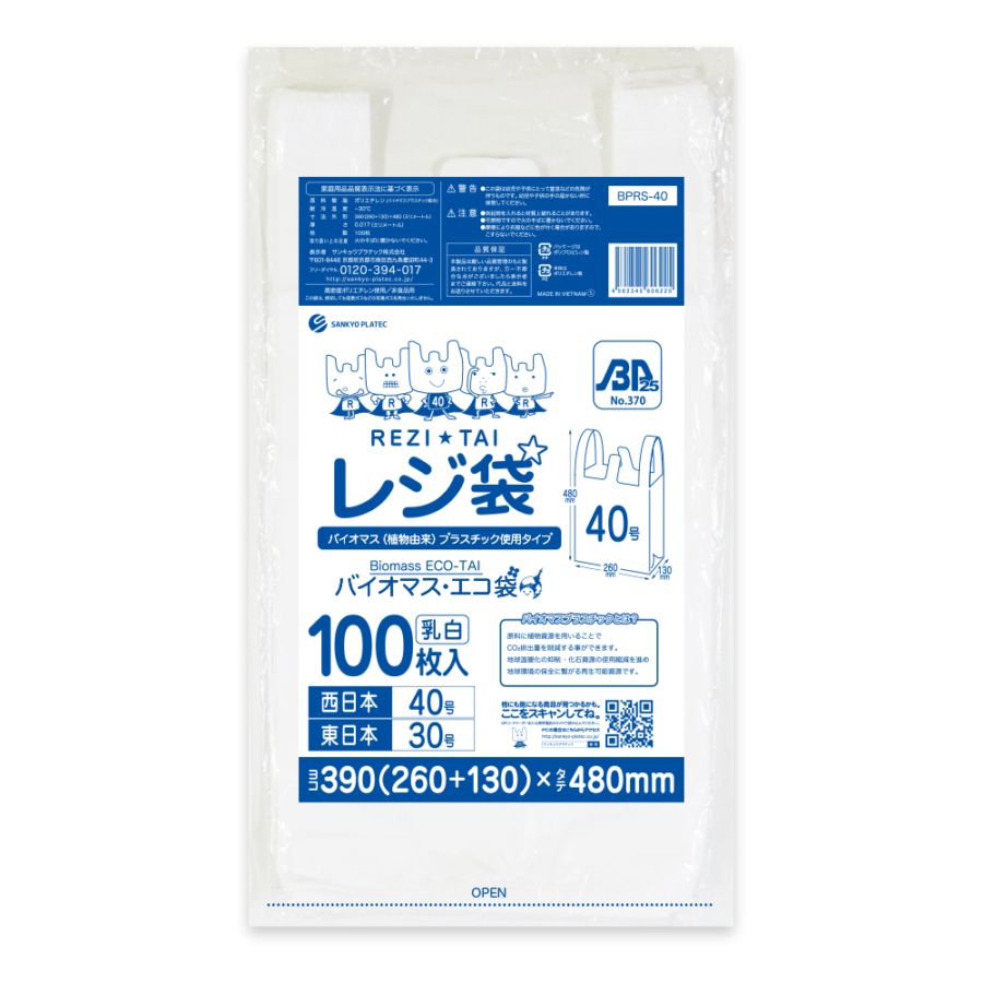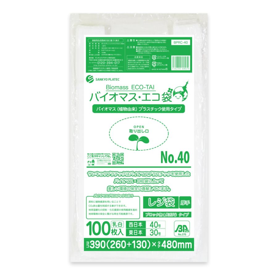 バイオマスプラスチック25%配合 レジ袋 厚手長舌片タイプ 西日本40号 ブロック有 乳白 0.017mm厚(100枚×40冊)