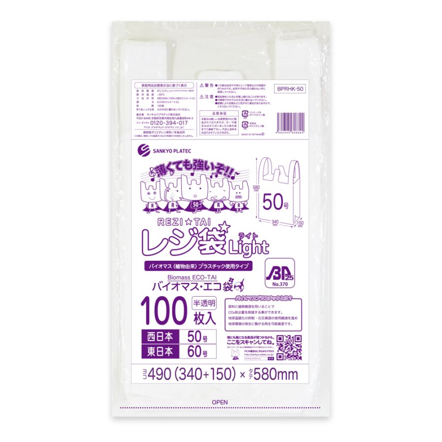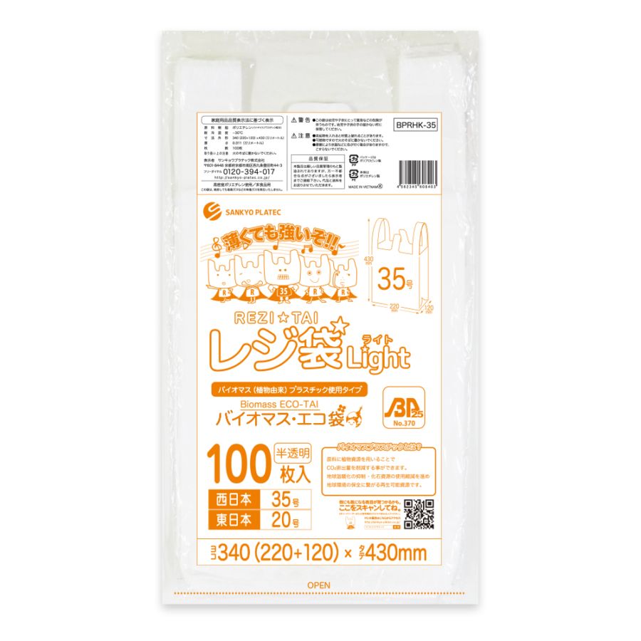 バイオマスプラスチック25%配合 レジ袋 薄手タイプ 西日本50号 ブロック有 半透明 0.018mm厚(100枚×20冊)