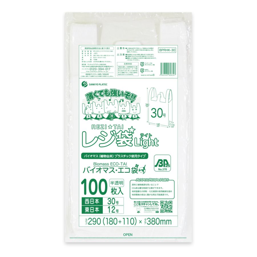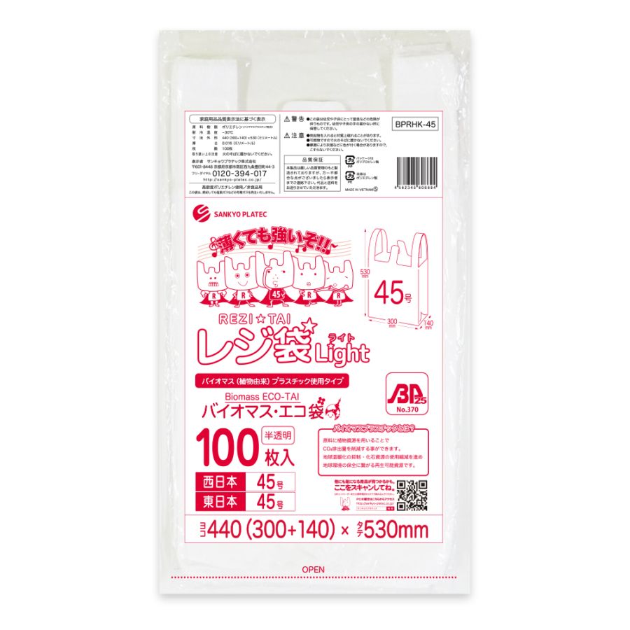 バイオマスプラスチック25%配合 レジ袋 薄手タイプ 西日本45号 ブロック有 半透明 0.013mm厚(100枚×30冊)