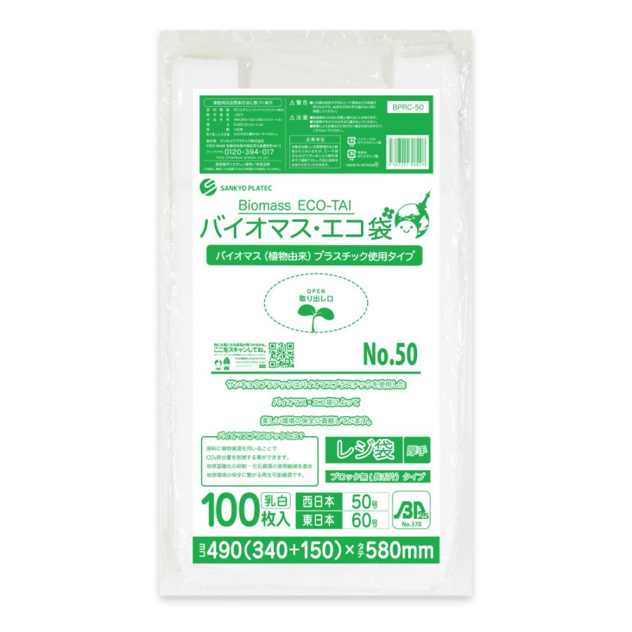 バイオマスプラスチック25%配合 レジ袋 厚手長舌片タイプ 西日本50号 ブロック有 乳白 0.023mm厚(100枚×20冊)