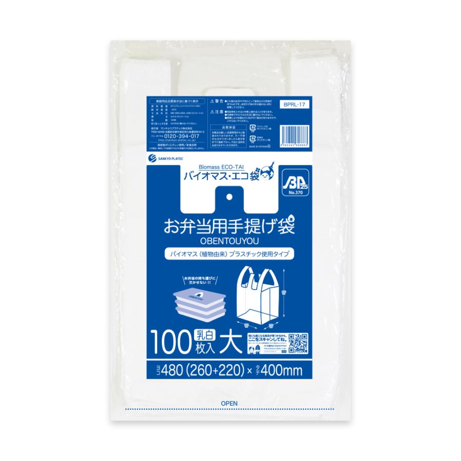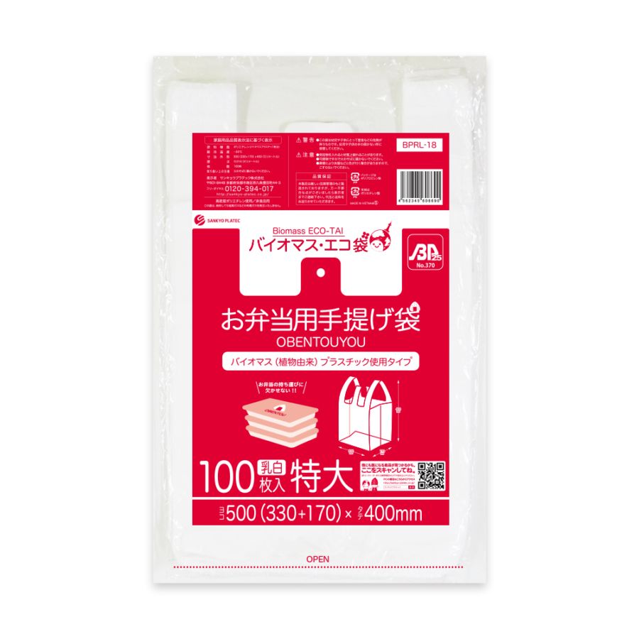 バイオマスプラスチック25%配合 お弁当用手提げ袋特大サイズ ブロック有 乳白 0.014mm厚(100枚×40冊)