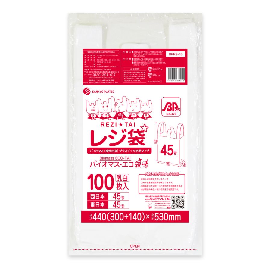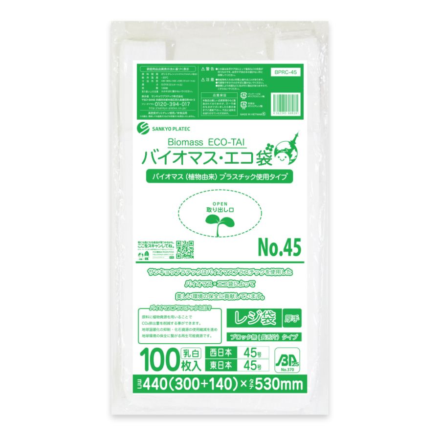 バイオマスプラスチック25%配合 レジ袋 厚手長舌片タイプ 西日本45号 ブロック有 乳白 0.019mm厚(100枚×30冊)