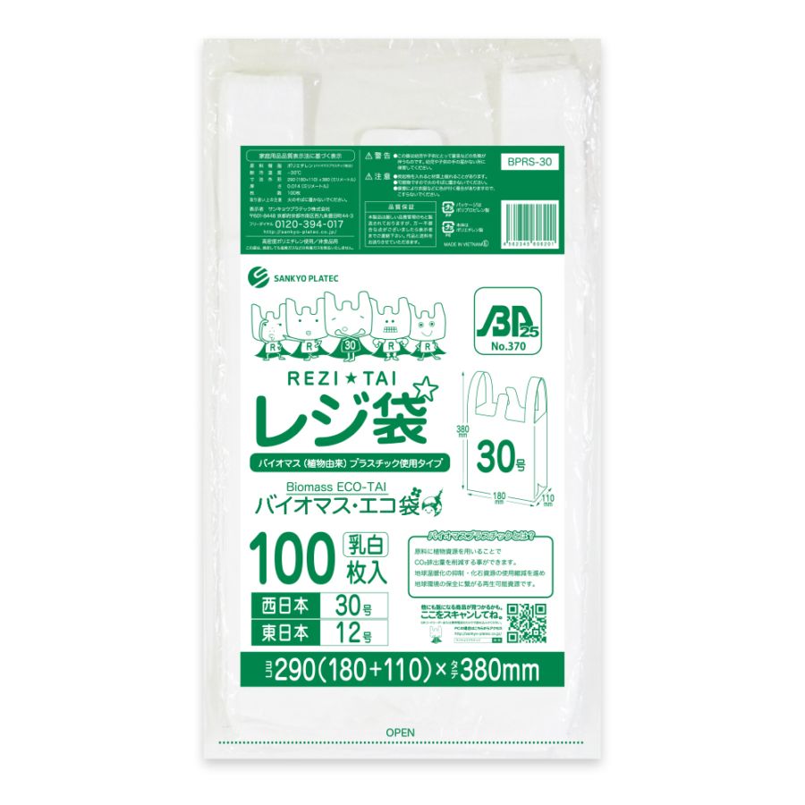 バイオマスプラスチック25%配合 レジ袋 厚手長舌片タイプ 西日本30号 ブロック有 乳白 0.014mm厚(100枚×80冊)