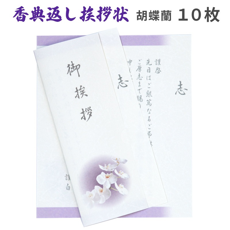 香典返し挨拶状 オーキッド 10枚 文章印刷済み 胡蝶蘭 カード 忌明け 満中陰 葬儀 法要 返礼