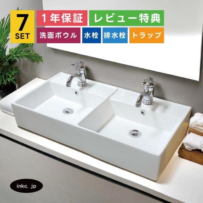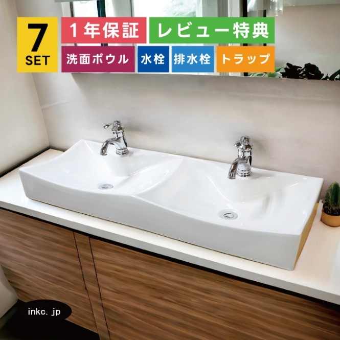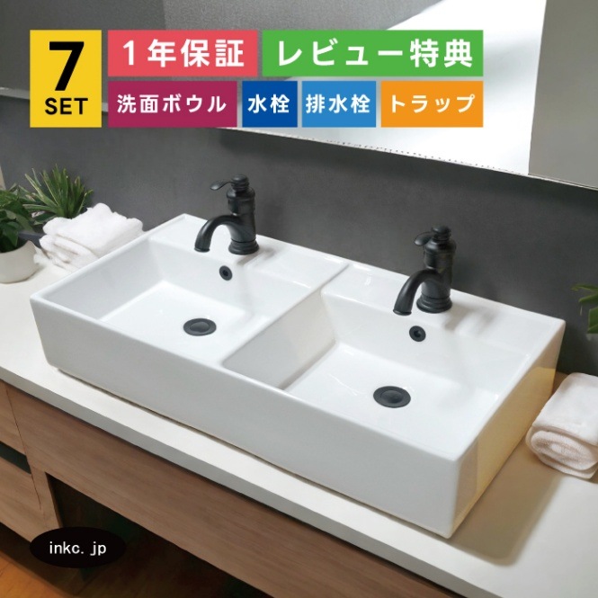 7点セット 2ボウル洗面+混合水栓+排水栓+排水トラップ 置き型 陶器 手洗い器 手洗い鉢 洗面台 ダブルボウル 大きい おしゃれ...