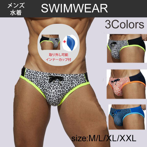 メンズ インナーカップ付き スイムウェア アニマル柄 ヒョウ柄 スイミング ビキニ 水着 男性用 海水パンツ ビーチ