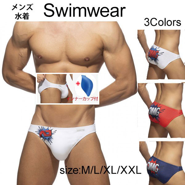 メンズ インナーカップ付き スイムウェア OMG アメコミ柄 スイミング ビキニ型 水泳 水着 男性用 海水パンツ ビーチ