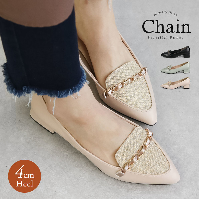 パンプス ポインテッドトゥ チェーン レディース ローヒール 太ヒール チャンキーヒール フォーマル 靴 黒 ブラック ベージュ ...