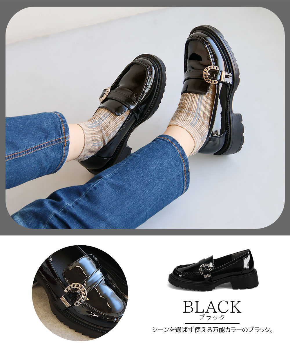 厚底 ローファー レディース 4.5cmヒール エナメル バックル ブラック ダークブラウン 歩きやすい 靴 大人 きれいめ シン...