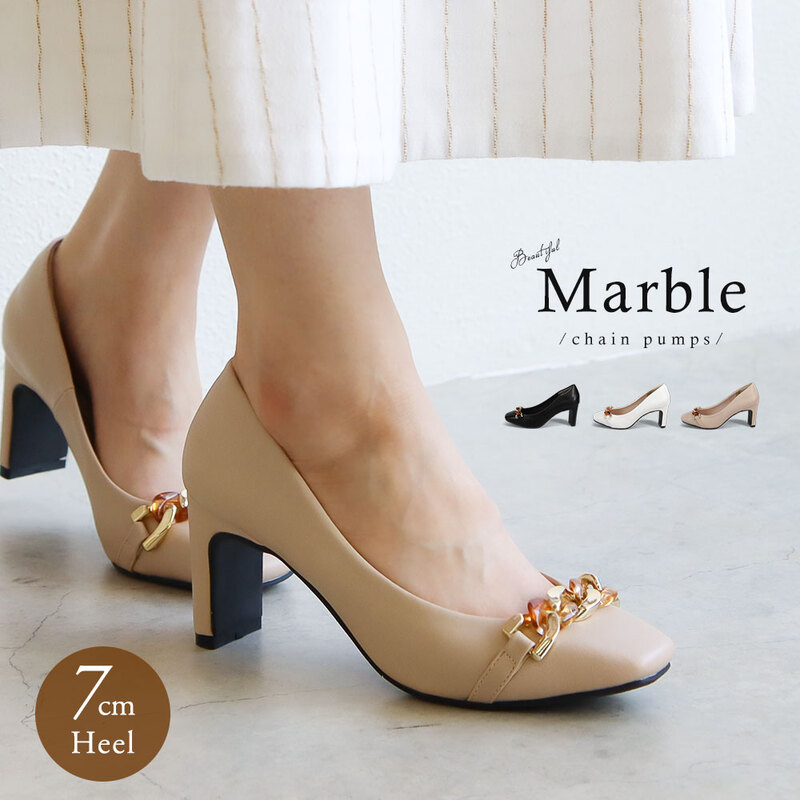 パンプス 黒 チャンキーヒール スクエアトゥ 脱げない 歩きやすい 靴 ハイヒール 黒 マーブル柄 ブラック ホワイト 白 ベージ...