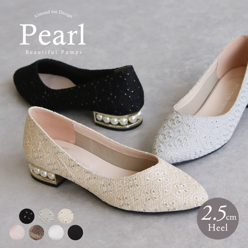 パンプス ローヒール 黒 アーモンドトゥ お呼ばれパンプス デザインヒール パール フラットシューズ 走れるパンプス 1398 1...
