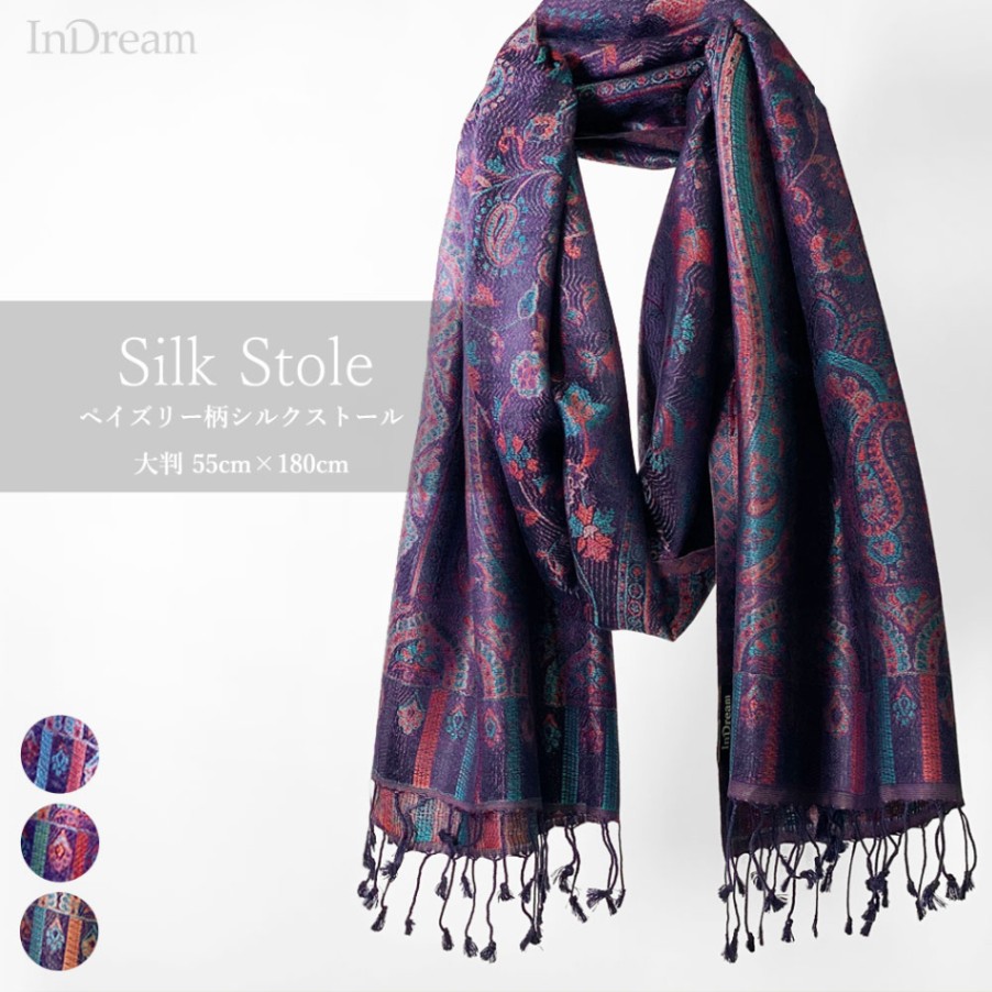 InDream ペイズリー柄 シルク ストール 中判 55cmx180cm スカーフ 紫 パープル クリスマス ギフト おしゃれ ...