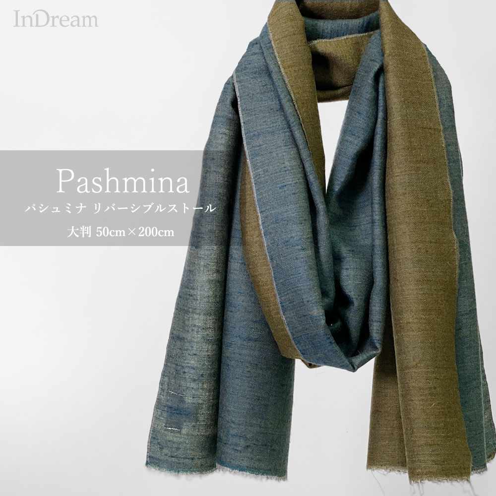 InDream 手織りパシュミナストールリバーシブル マフラ― カシミヤ100% ブルー カーキ 50cm幅 父の日プレゼント ギ...