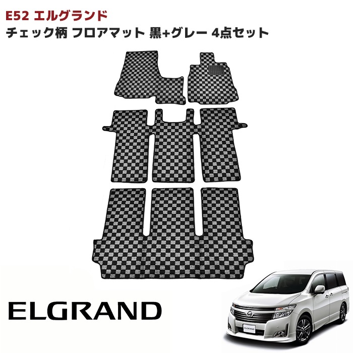 日産 エルグランド E52 前期 フロアマット チェック柄 黒 × 灰 4P 1台分 7人乗り
