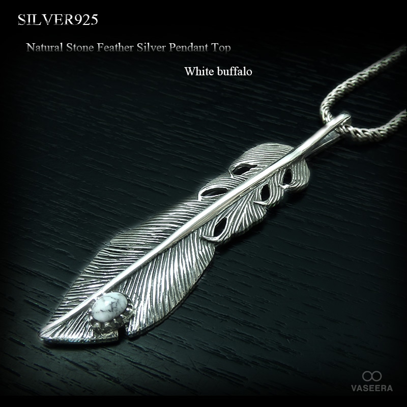 ホワイトバッファロー(ハウライト)埋め込み 75mm ネイティブ フェザー(羽根) シルバー ペンダント トップ 【シルバー925...