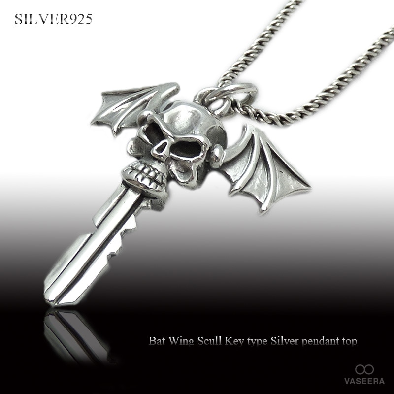 バットウィング・スカル(蝙蝠&髑髏) キースタイル(鍵型) シルバー ペンダント トップ 【シルバー925/SILVER925 /...