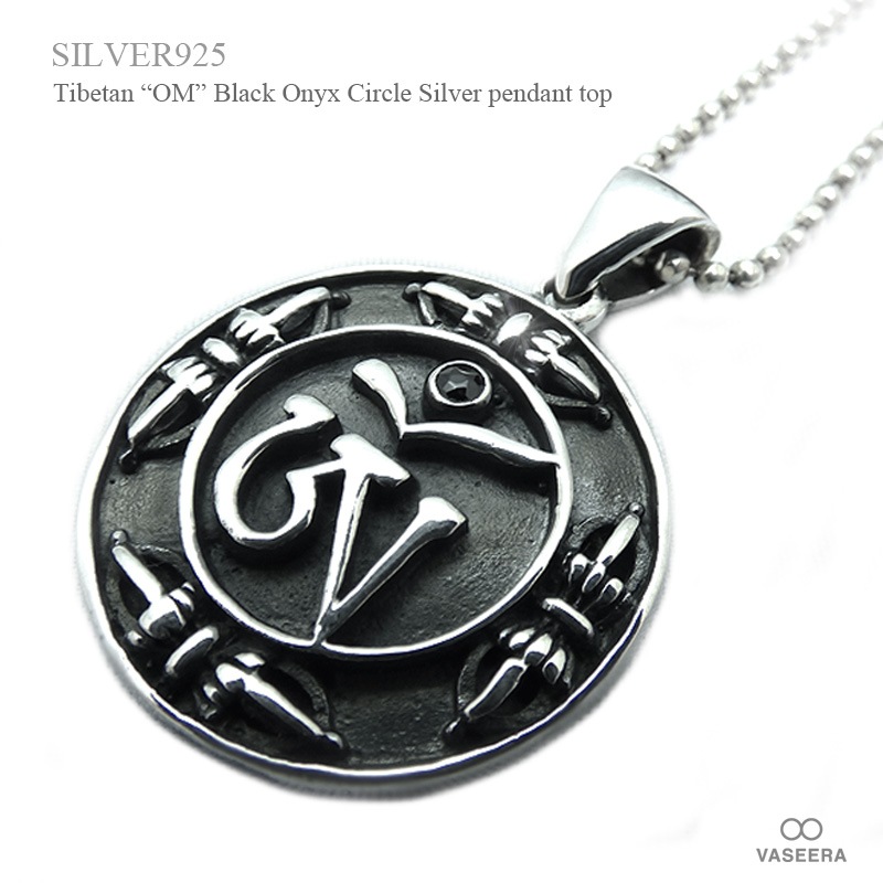 チベット密教 マントラ”Om(オム)” オニキス埋め込み サークル型 シルバー ペンダント トップ 【シルバー925/SILVER...