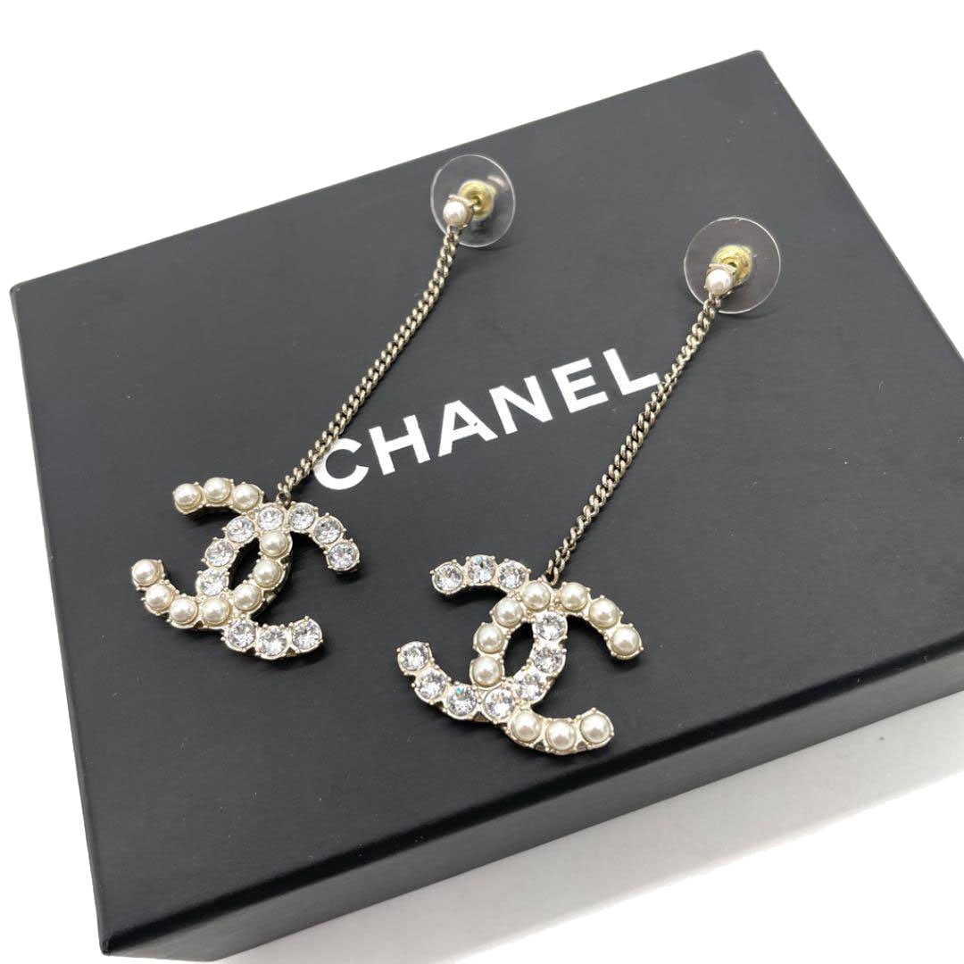 CHANEL シャネル ロングチェーンピアス ココマーク ラインストーン フェイクパール ゴールド B20B