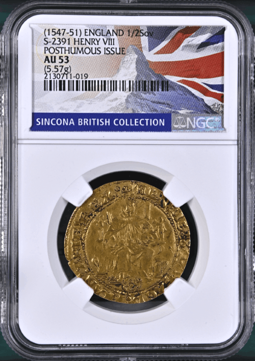【動画あり】グレートブリテン 1547-51年 エドワード6世 ヘンリー8世名義 1/2ソブリン金貨 NGC-AU53