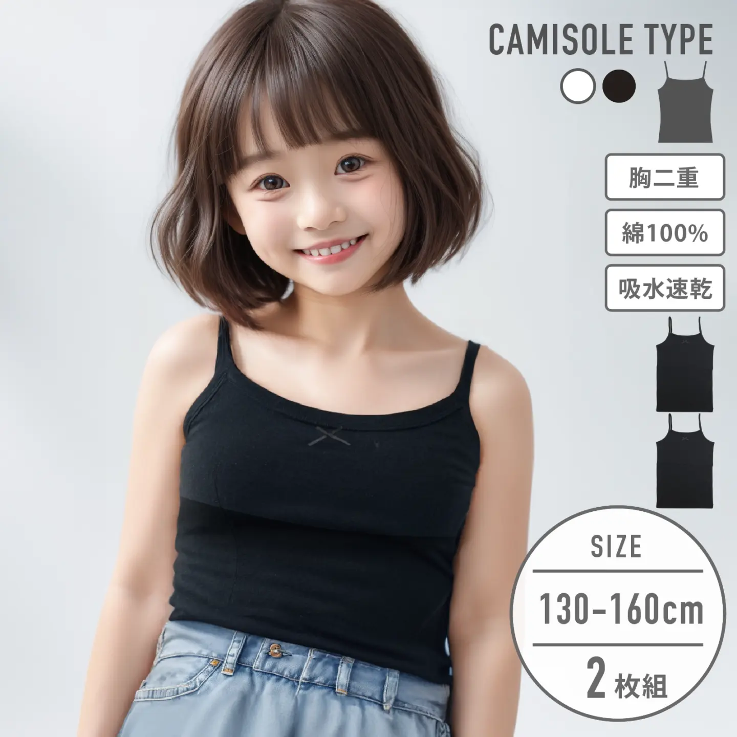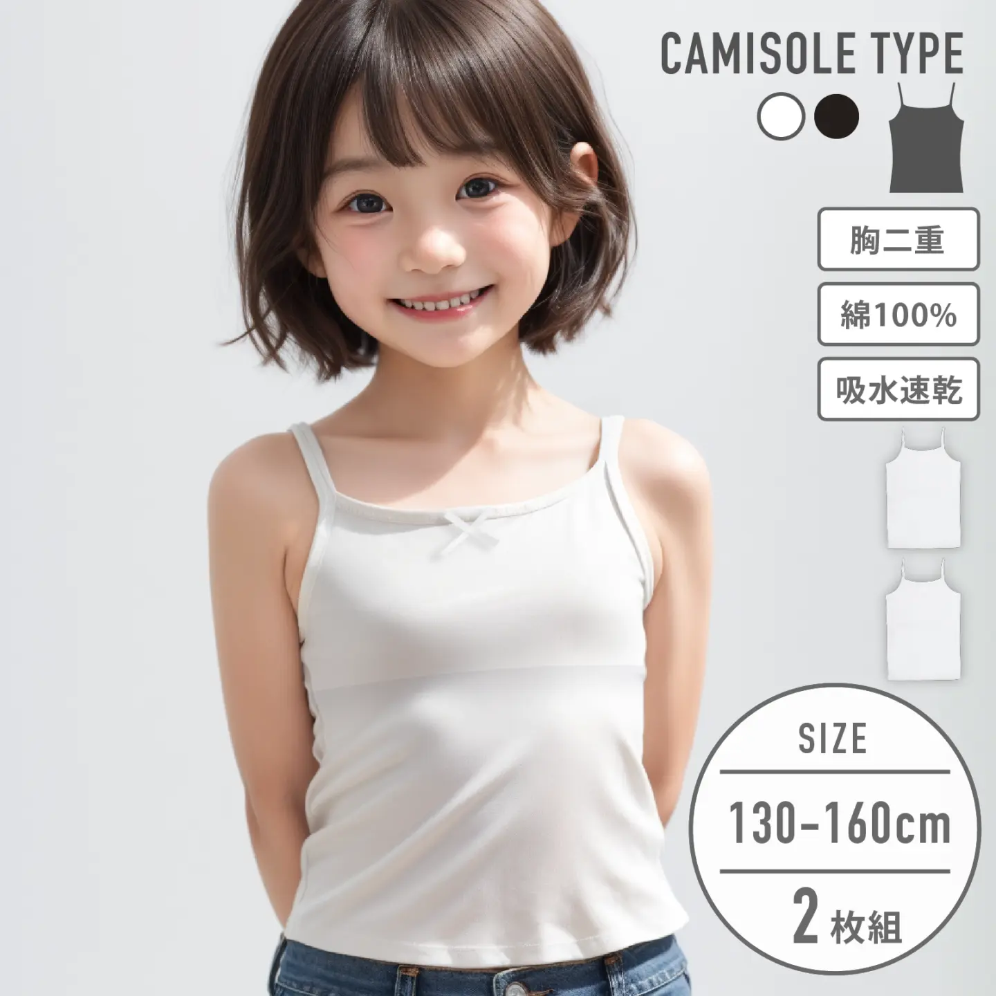 【女の子】モールドカップ付きキャミソール ブラキャミ 2枚組 150~165cm 胸二重【吸水速乾】