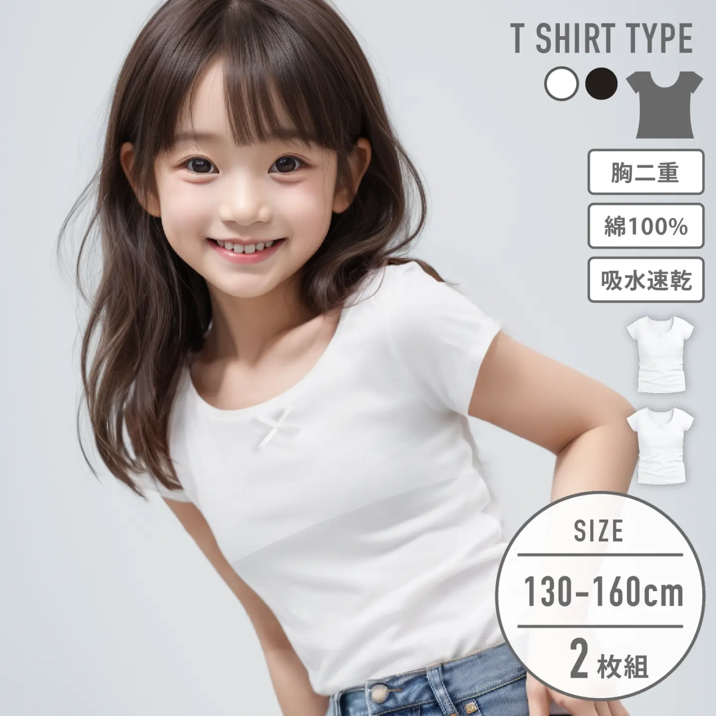 【女の子】ジュニア 胸二重半袖インナー| 2枚組 白| 130~160cm【吸水速乾/綿100%】
