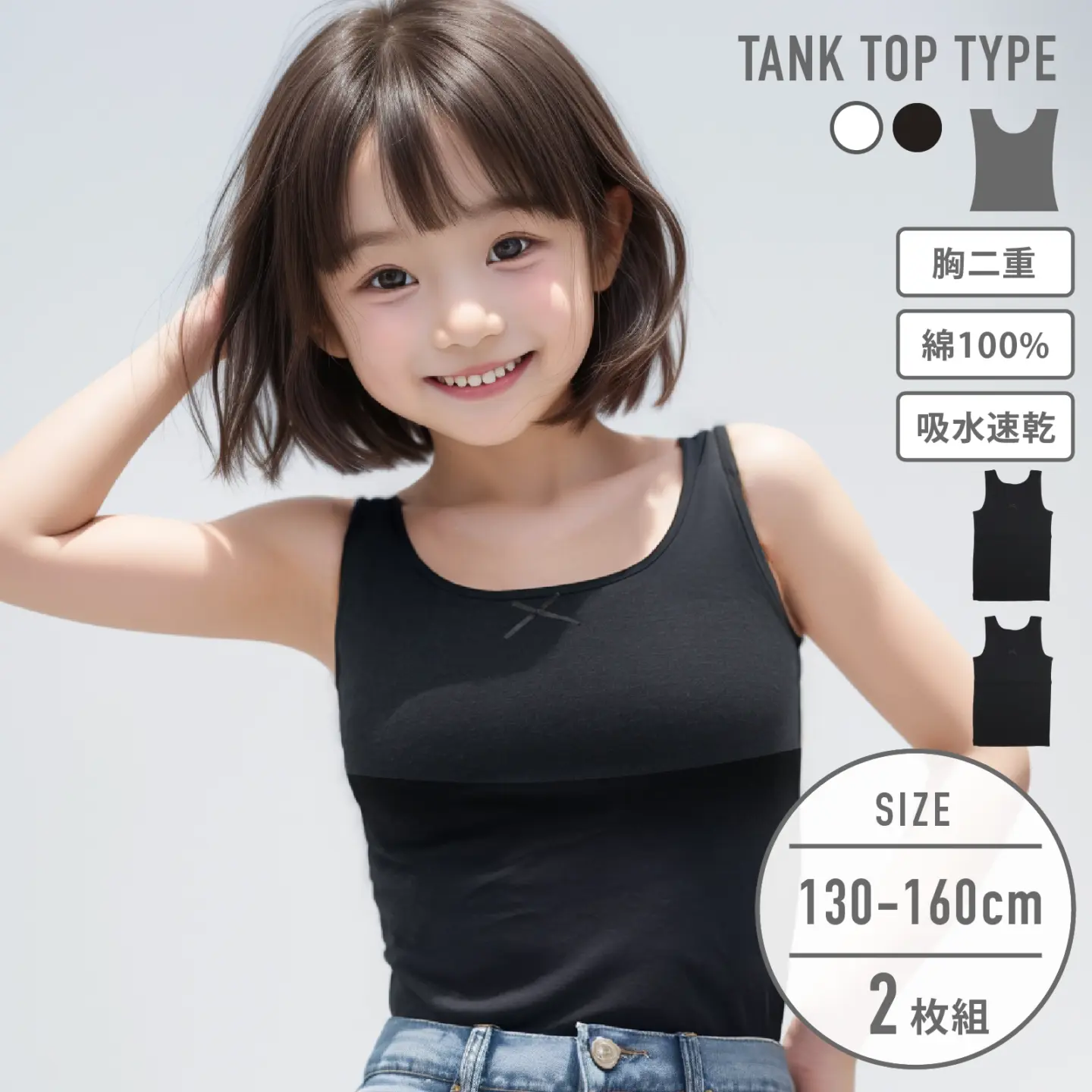 【女の子】モールドカップ付きタンクトップ ブラトップ 2枚組 150~165cm 胸二重【吸水速乾】
