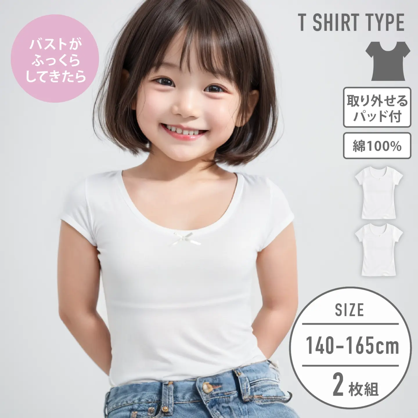 【女の子】ジュニア パット付半袖インナー| 2枚組 白| 140~165cm【綿100%】