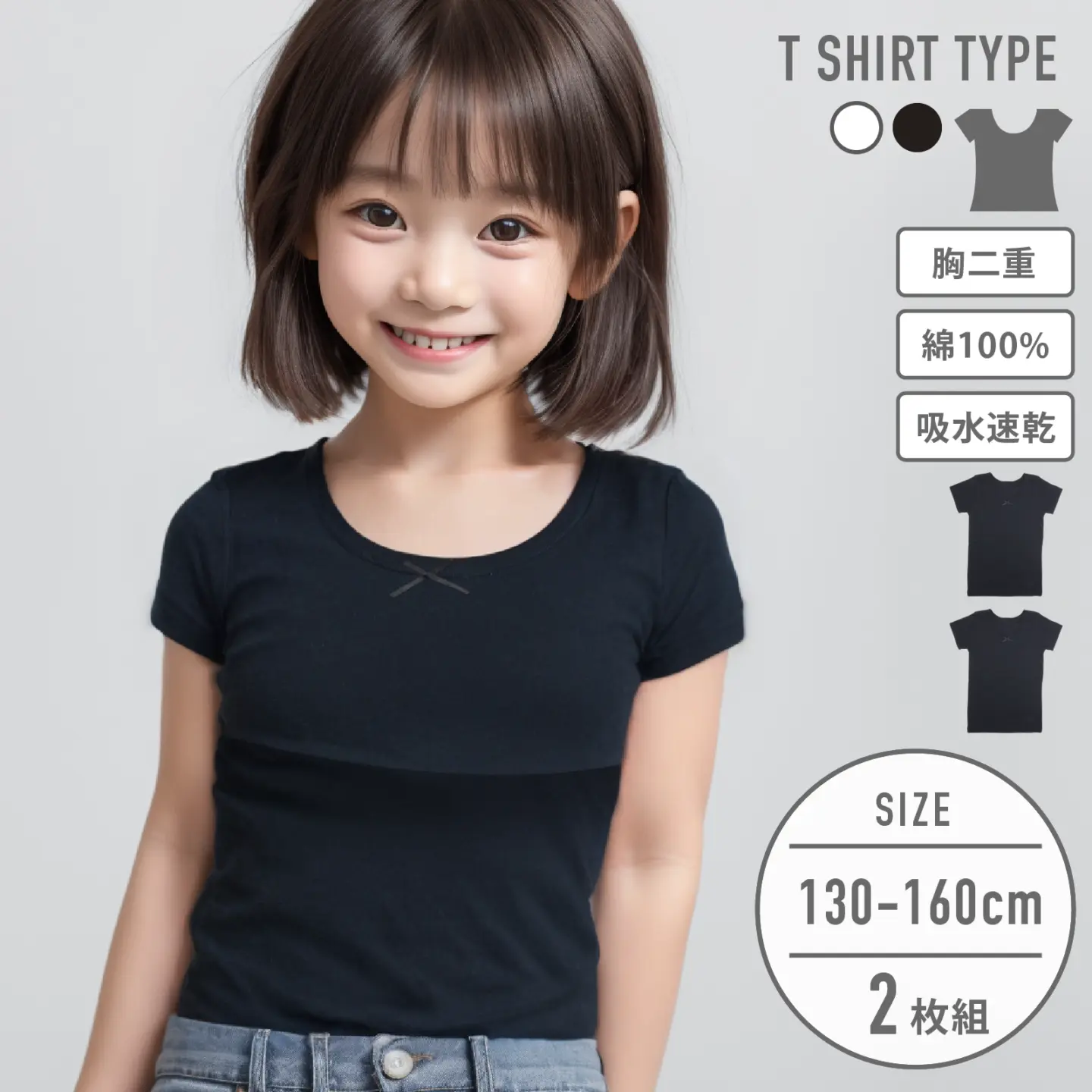 【女の子】ジュニア 胸二重半袖インナー| 2枚組 黒| 130~160cm【吸水速乾/綿100%】