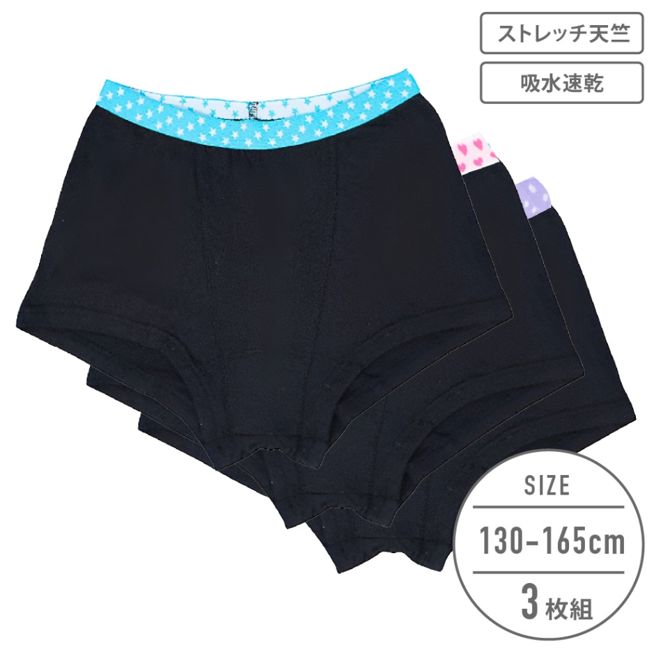 【女の子】ボクサーパンツ 3枚組/デザインゴム 130~165cm【ストレッチ天竺/吸水速乾】
