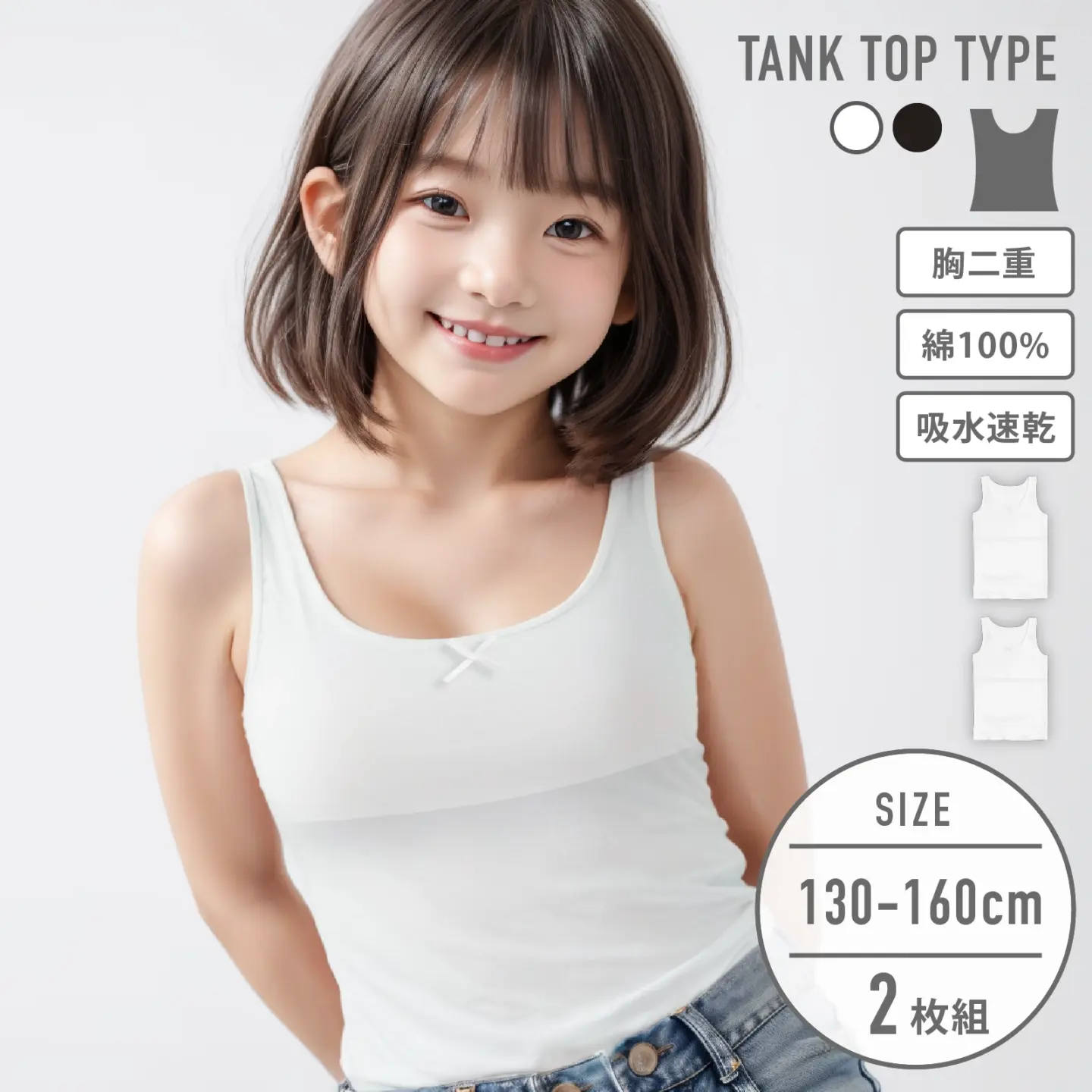 【女の子】ジュニア 胸二重タンクトップ| 2枚組 白| 130~160cm【吸水速乾/綿100%】