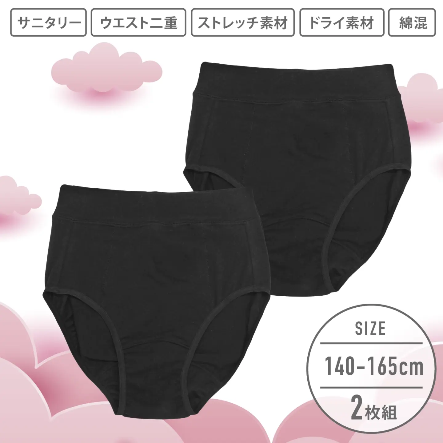 【女の子】ジュニアサニタリーショーツ 2枚組| 黒(ブラック)無地| 140~165cm【ウエスト生地二重構造・ドライ・ストレッチ...