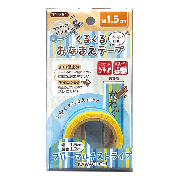 お名前ラベルシール 『くるくるおなまえテープ ブルーマルチストライプ 1.5cm×1.2m 11-781』 KAWAGUCHI カ...