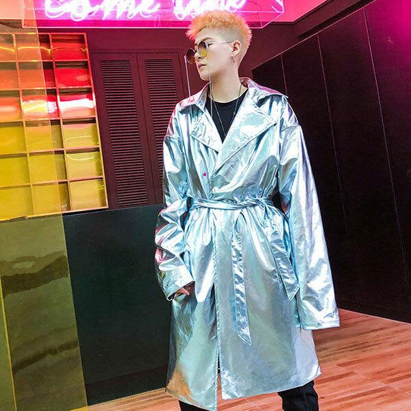 メンズ メタリック トレンチコート ロングコート ミドル丈 コート ウエストベルト 舞台衣装 派手 光沢 ゴージャス かっこいい ...