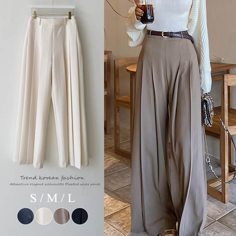 てろんと感 ロング丈 プリーツ ワイドパンツ スラックス