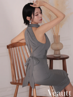 [Veautt/ヴュート] ホルターネック フロントシアー ビジューチェーン タイト ミディアムドレス ワインレッド モカ グレー...