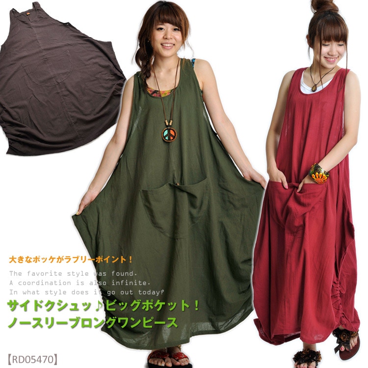 マキシ丈ワンピース サイドクシュッ♪ビッグポケット!ノースリーブロングワンピース