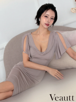 [Veautt/ヴュート] ドレープネック スリットスリーブ パールチャーム タイト ミディアムドレス キャバドレス vt0225...