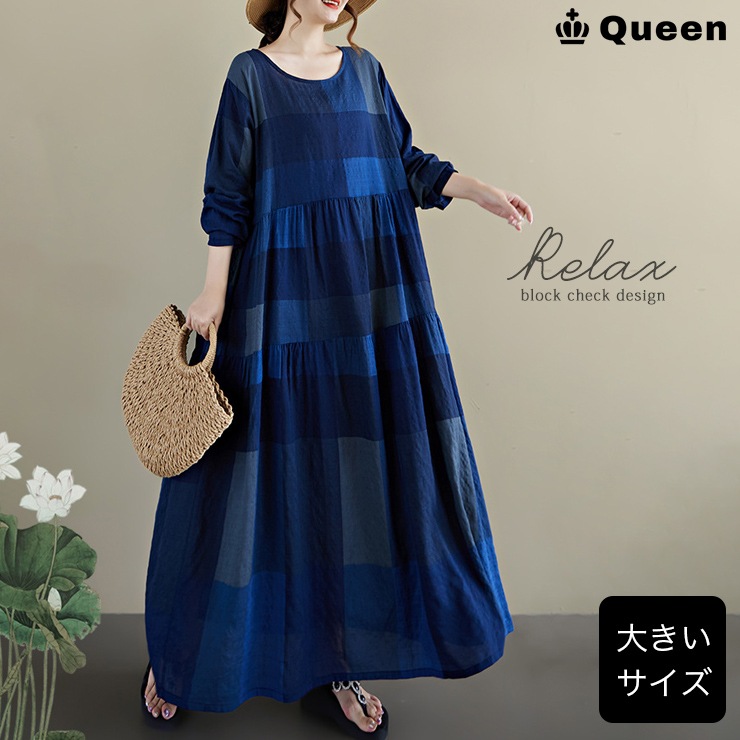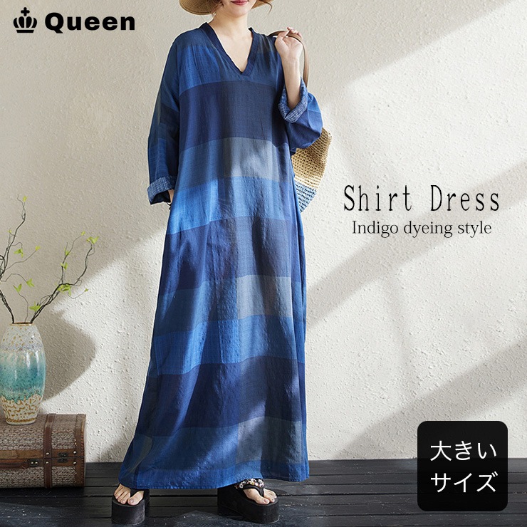 大きいサイズ ワンピース シャツワンピ 長袖 チェック柄 マキシワンピ レディース Vネック 薄手 藍染風 春夏 (371018)
