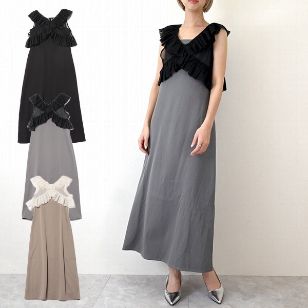 ツイル×チュールフリルベストセットキャミワンピース