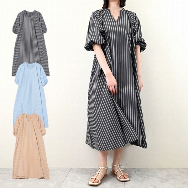 先染めランダムストライプボリュームスリーブワンピース