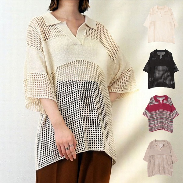 スクエアメッシュニットハーフスリーブポロカラープルオーバー